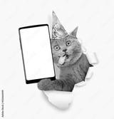 Crazy cat with tongue out wearing party cap showing smartphone with white blank screen in it paw through torn white paper hole. Empty free space for mock up, banner