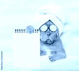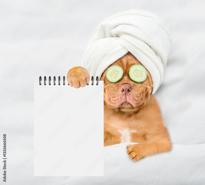Funny Mastiff puppy with towel on it head and with a piece of cucumber on it eyes relaxing on the bed at home and showing empty list. Top down view. Empty space for text