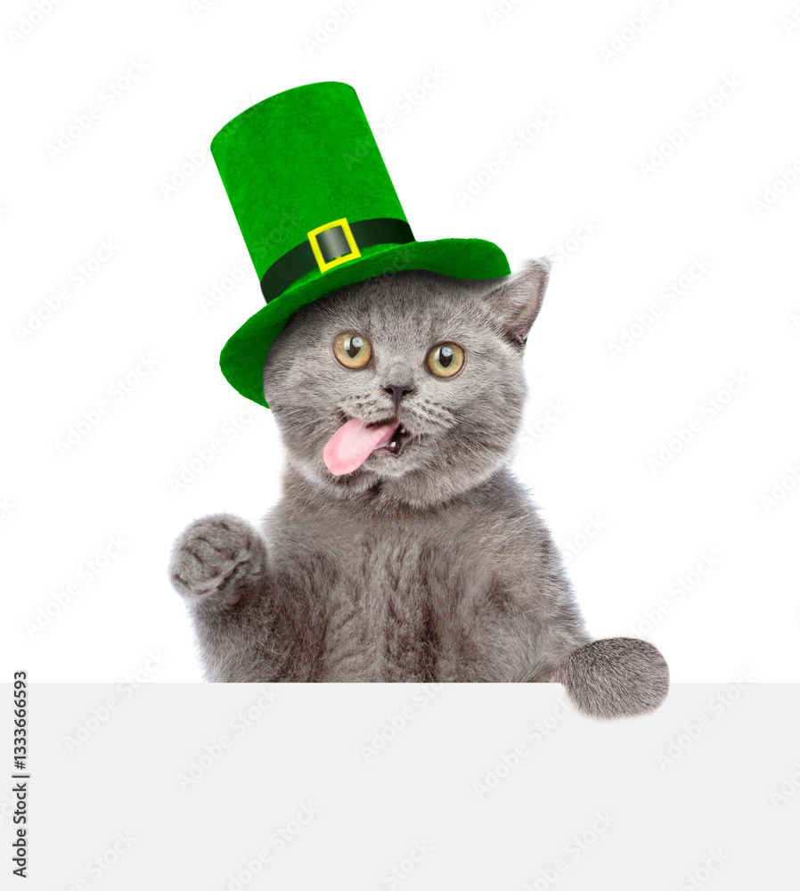 St. Patricks Day. Funny cat wearing green hat looking above blank banner with tongue out. isolated on white background. Space for text