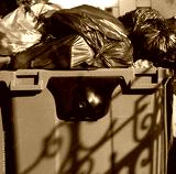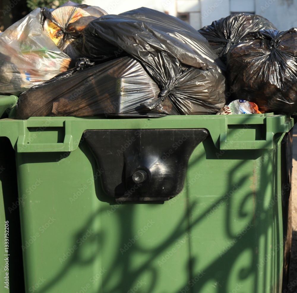 Plastic trash container. A big, green trash can for general household waste. Garbage equipment for household waste. Garbage can for food waste and trash. Environmental situation and garbage in town