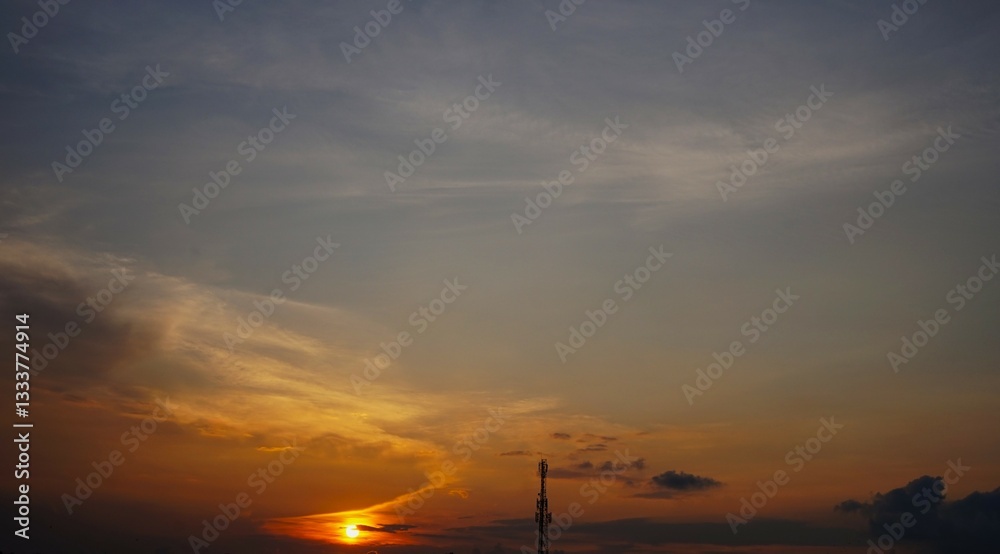 sunset and evening sky with yellow clouds highlighted by the sun, black clouds combined with sunlight create a dramatic sky atmosphere