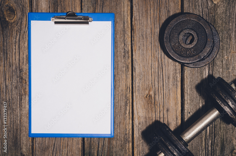 Fitness training plan of personal trainer with old iron dumbbells or exercise weights outdoor on an old wooden deck, floor or table in the gym. Image frame taken from above, top view.