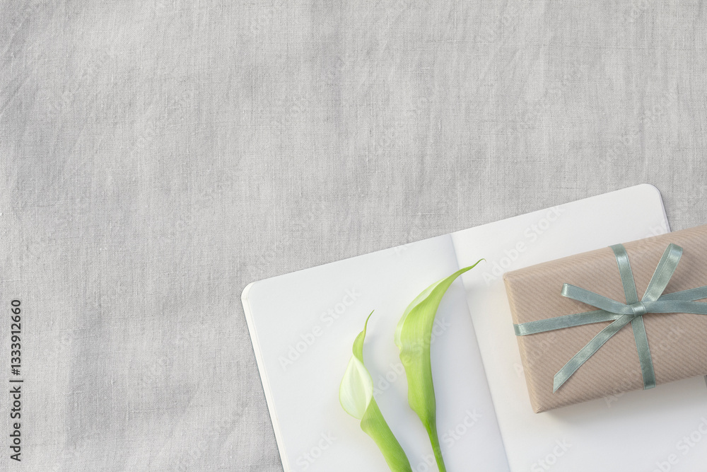 Photograph of a present decorated with moss green ribbon and white calla lilies placed side by side, over a spread of notes on a gray fabric background
