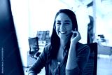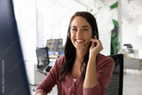Happy customer contact center employee posing at workplace, touching headset with microphone, looking at camera, smiling. Positive Latin businesswoman, support service operator portrait