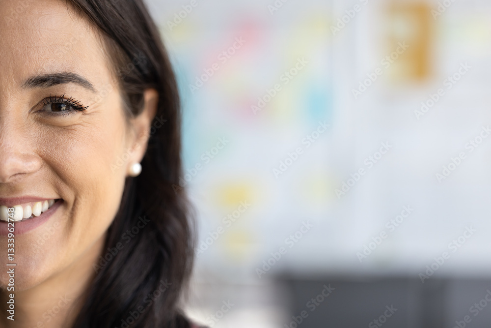 Half face portrait of happy beautiful Latin business woman looking at camera, smiling. Close up cropped shot with copy space. Hispanic female model promoting facial beauty care