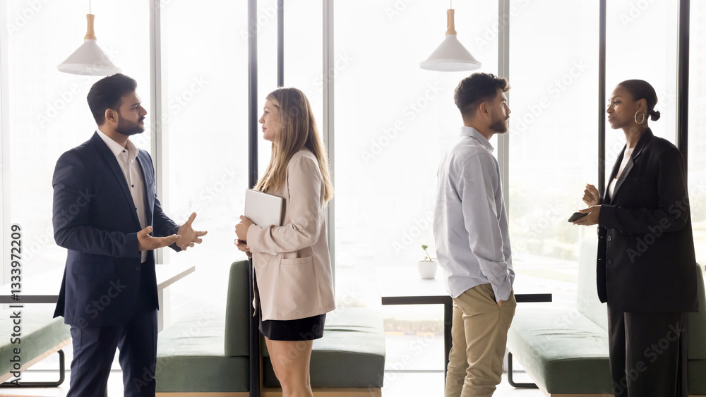 Side view four multiracial teammates standing in modern spacious coworking space and talking, lead conversation, discussion business related matters, planning cooperation, consider project completion