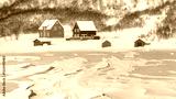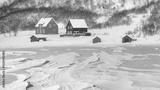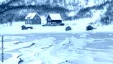 Cracks on the surface of the ice next to red and orange houses (cabin) in winter -Beautiful landscape with Frozen lake - Tromso, Norway