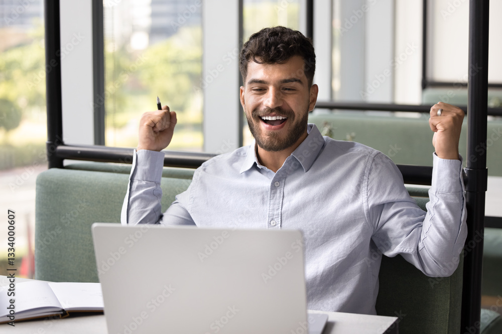 Young 25s Arabian man reads exciting news on laptop, clenched his fists looks at device screen with joyful expression, achieved successful result, completed challenging task, celebrate financial gain
