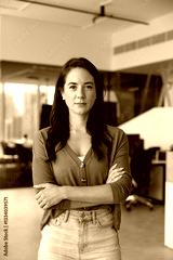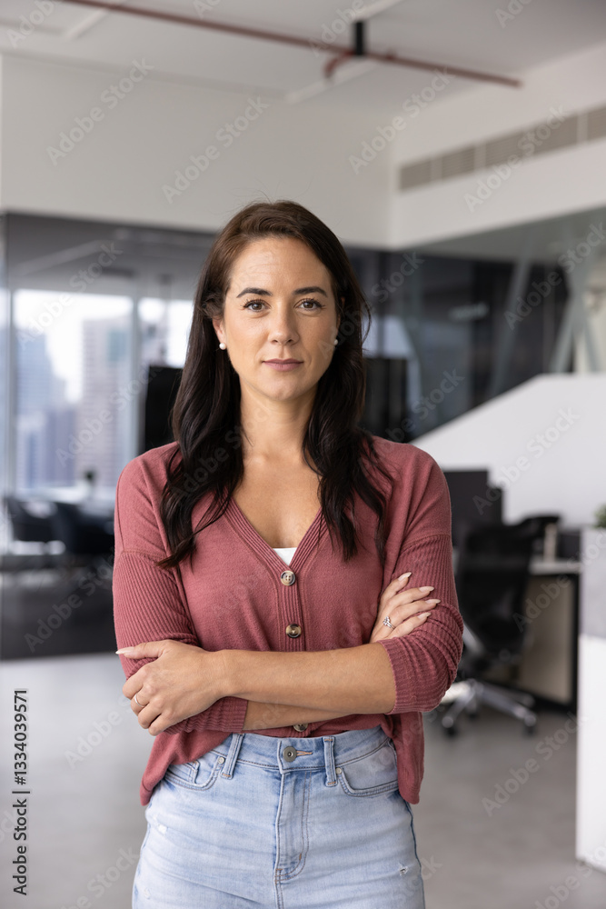 Serious confident young Latin business owner woman posing in office alone, standing with hands crossed, looking at camera. Female entrepreneur, company leader, manager vertical portrait