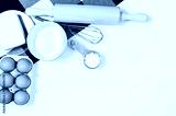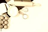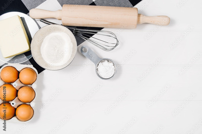 Baking a cake or pizza ingredients background. Top view photograph with kitchen utensils on vintage, natural, white, wooden background.