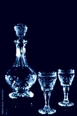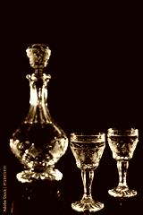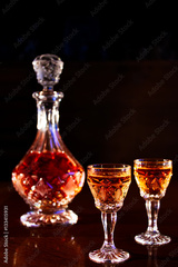 crystal decanter and glasses full of strong alcoholic drink, carafe and a dram of alcohol on a wooden table, dark background