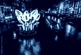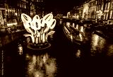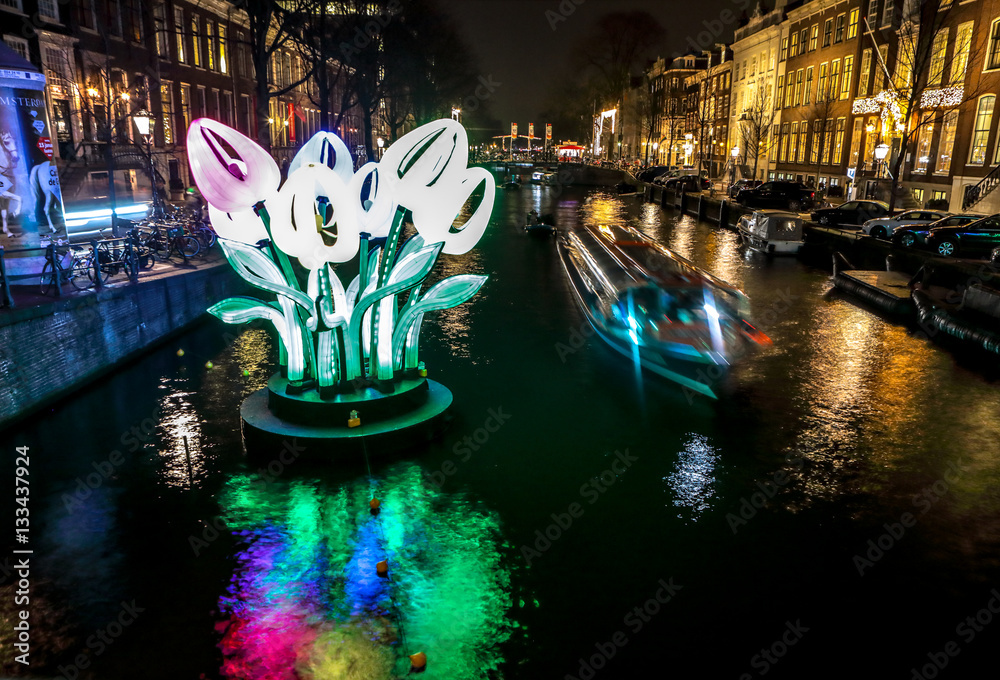 AMSTERDAM, NETHERLANDS - JANUARY 11, 2017: Cruise boats rush in night canals. Light installations on night canals of Amsterdam within Light Festival. January 11, 2017 in Amsterdam - Netherland..