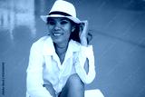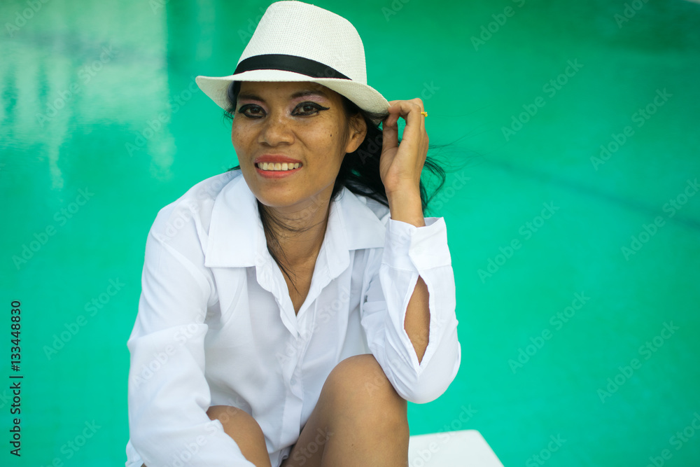 Sexy woman in white shirt posing on the swimming pool