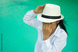 Sexy woman in white shirt posing on the swimming pool