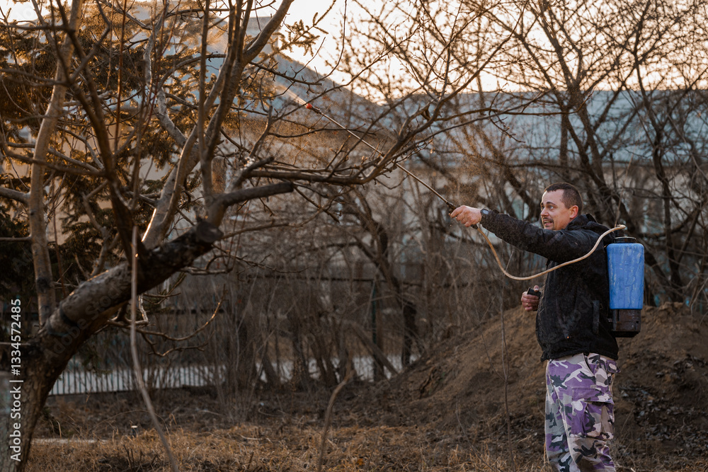 Man Spraying Trees with Pesticide in Backyard Garden During Late Afternoon