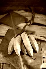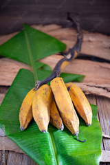 Bunch of ripe bananas resting on vibrant green banana leaf