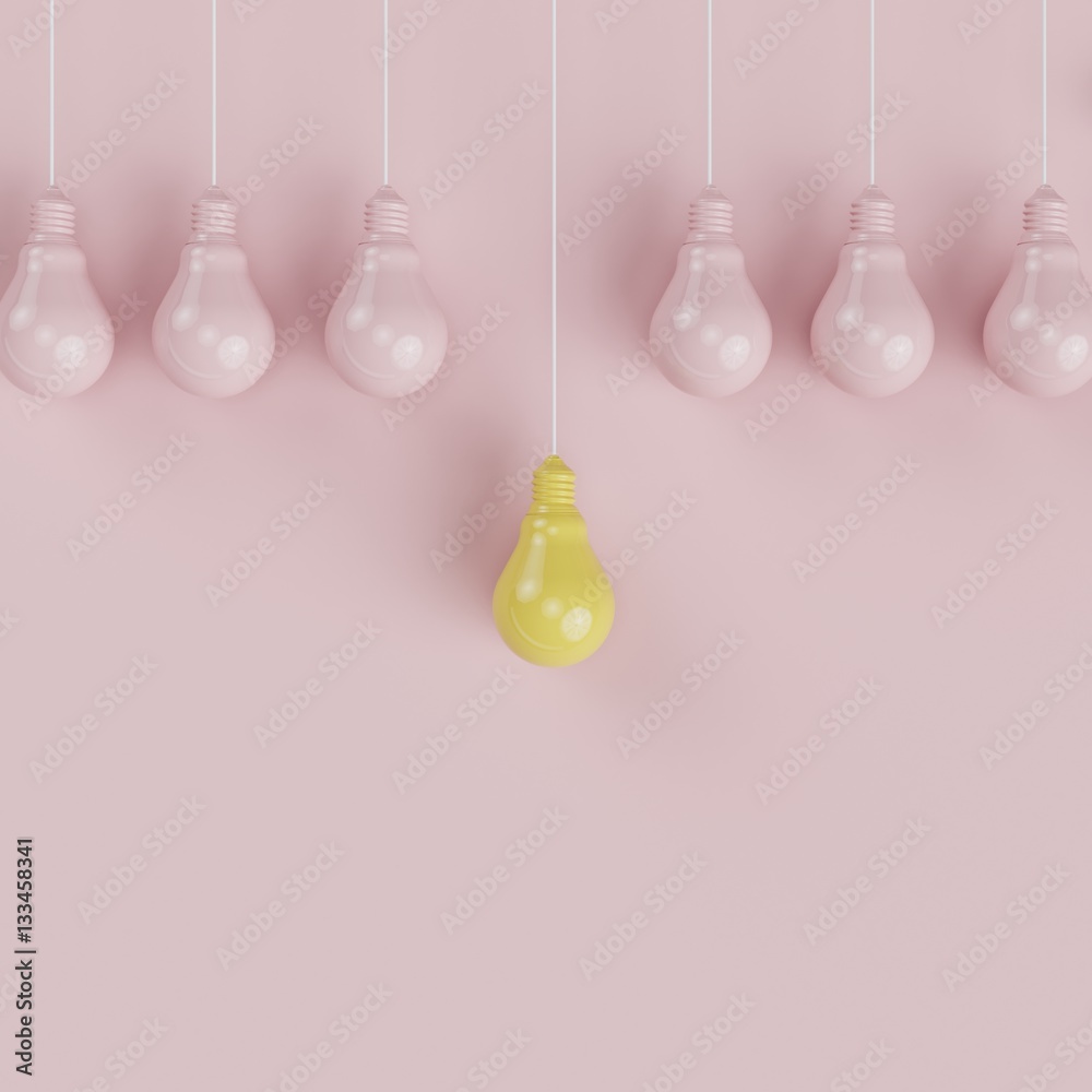 Hanging outstanding yellow pantone pastel light bulbs different idea on pink background , Minimal concept idea , flat lay , top