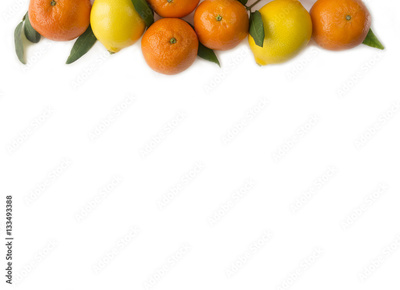 Mandarins and lemons on white background. Tangerines with lemons at border of image with copy space for text. Top view.