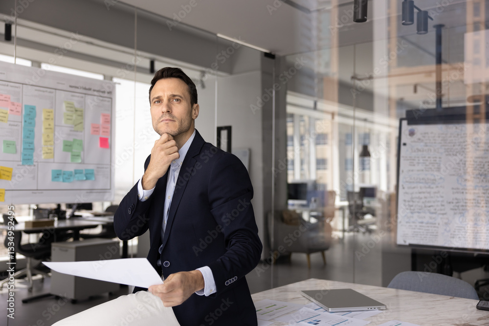 Serious pensive business product owner man working in office workspace alone, holding legal paper document, analyzing financial report, looking away, thinking on financial plan, project strategy