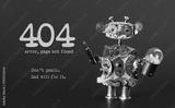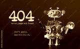 Error 404 page not found template for website. Steam punk style toy robot toy with screaw driver and light bulb lamp, warning message Don't panic Dad will fix it. Dark violet background.