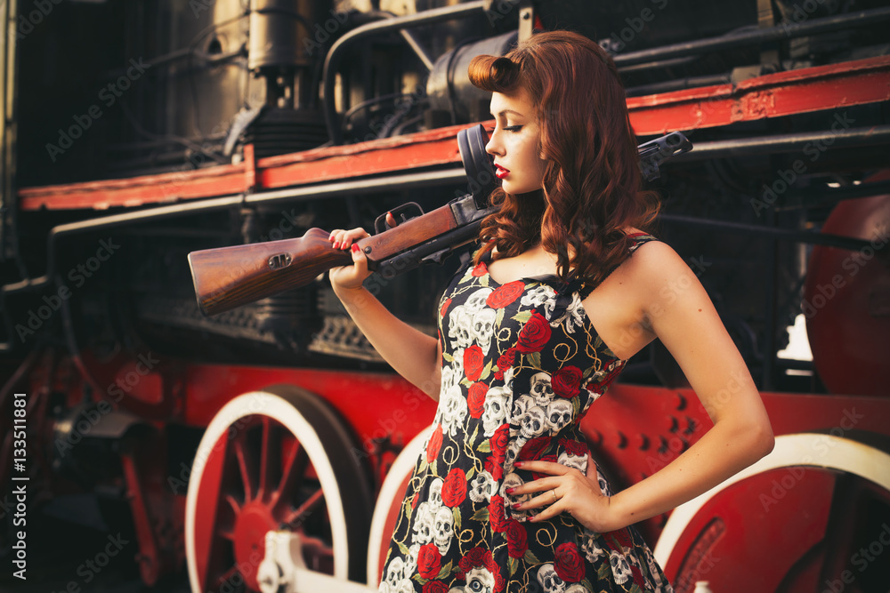 Beautiful sexy brunette retro woman with pin-up hairstyle and make up