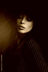 Beautiful woman wearing retro hat and black stripwd shirt. fashion studio shoot.
