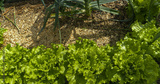 TOP DOWN: Vibrant row of fresh, green lettuce thrives in a maintained raised garden bed. Vegetables are growing in rich, nutrient soil covered with mulch, enhancing moisture retention and weed control