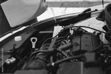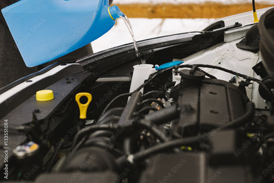 Car maintenance. Man pouring car winter windshield washer fluid outdoor. Closeup image taken outdoors.