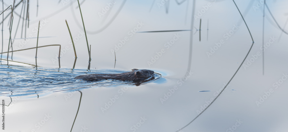 Common beaver (Castor Canadensis) swims quietly along, amongst water grass, in calm lake water on his way to beaver world. Small animal leaves a wake behind his tail.