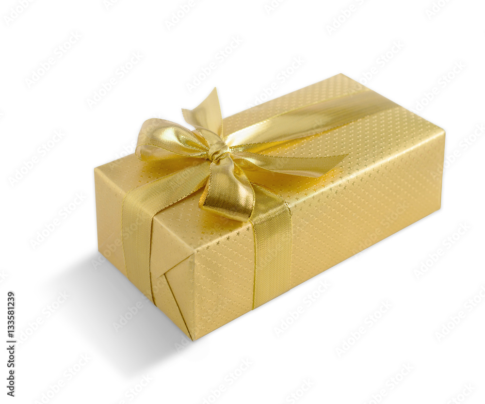 Gold gift box with golden ribbon over white background. Clipping path included.