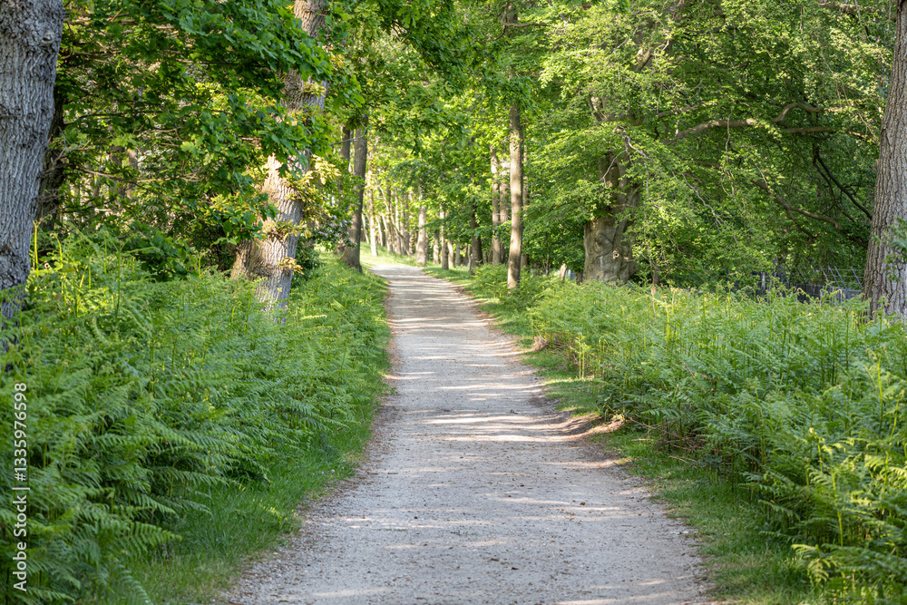 An empty white sand path framed by lush greenery during summer outdoor at daytime in the forest at the Amsterdamse Waterleidingduinen in Vogelenzang in The Netherlands.