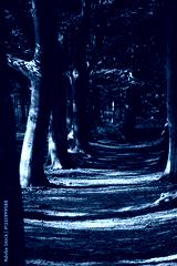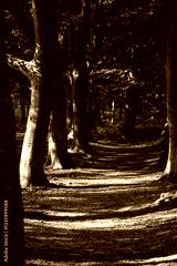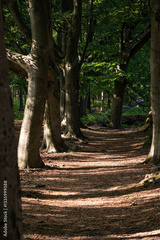Vertical picture of an empty forest path without people with sun shines through the green leaves of the trees outdoor at daytime in a forest in The Netherlands.