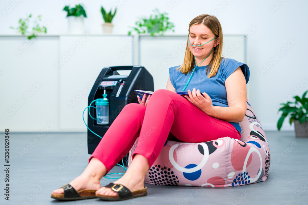 Oxygen therapy, supplemental oxygen. Young woman inhaling oxygen through nasal cannula attached to concentrator machine.