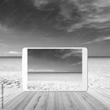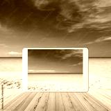 Tablet pc on wood table. Summer beach.