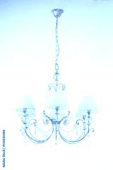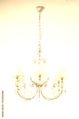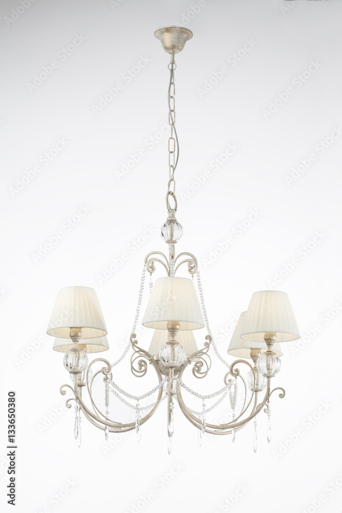 elegante lampadario in metallo, con pendenti in cristallo e paralumi in tela