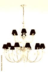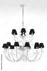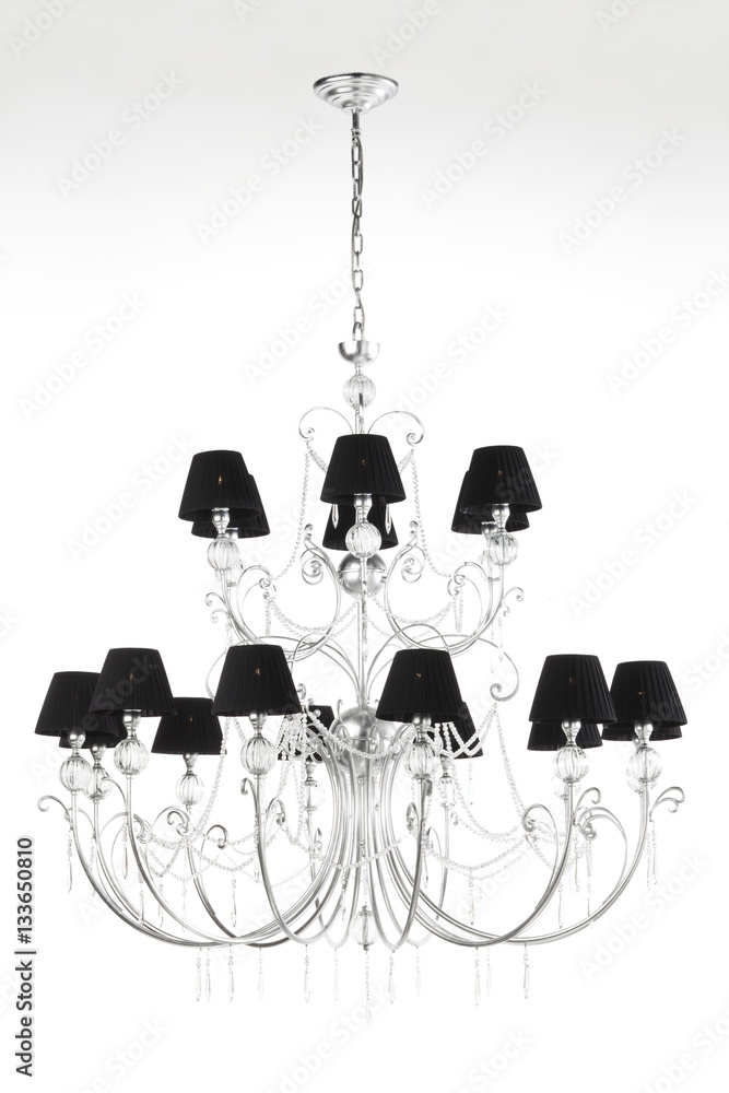 elegante lampadario in metallo, con pendenti in cristallo e paralumi in tela
