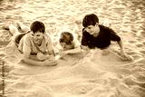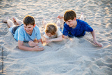 Three children playing with sand on sunset ocean beach. happy family, two school boys and one little preschool girl. Siblings having fun together. Bonding and family vacation in Andalucia, Spain