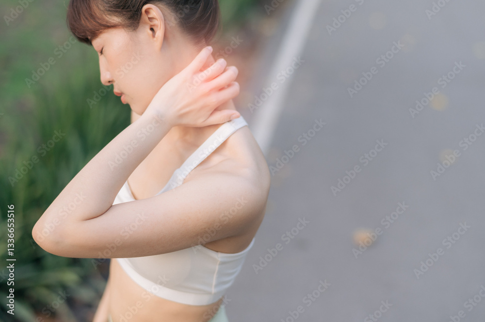 cheerful young woman in casual attire enjoys outdoors, stretching her arms wide amidst lush greenery and sunlight filtering through trees