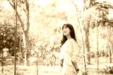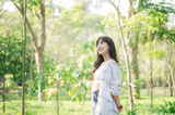 cheerful young woman in casual outfit enjoys sunny day in lush green forest, surrounded by trees and natural light
