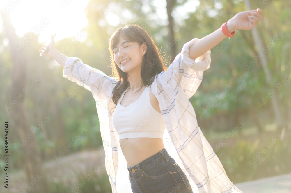 Asian woman enjoying summer outdoors, breathing fresh air with arms outstretched, feeling relaxed and happy in natural park setting