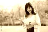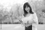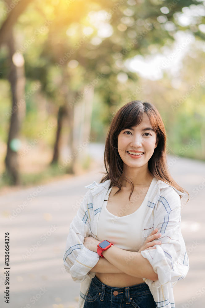 Asian woman enjoying summer outdoors, smiling while checking her smartwatch and phone, surrounded by fresh air and greenery