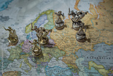 The Roman warrior pawns fight a battle on the world map. War between Russia and Ukraine