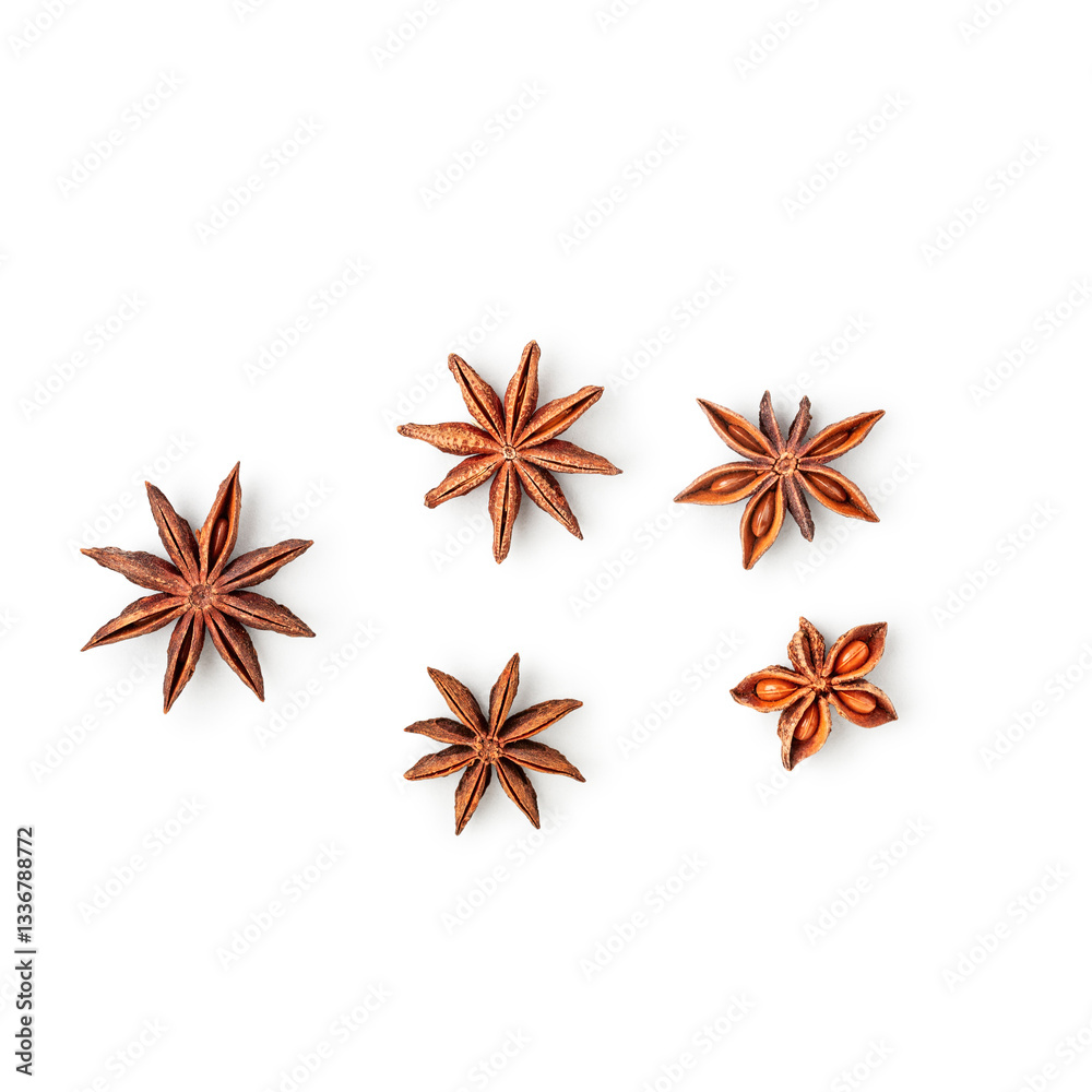 Spices anise stars photography isolated on white background. Clipping path. Original shadow.