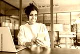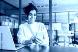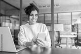 Hispanic business woman manager using cell phone mobile app, laptop. Smiling Latin or Indian student girl holding smartphone sitting in office or modern library, working online on gadget, copy space.