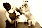professional woman drying wet dog, in the grooming salon. Making beautiful view of pet hair