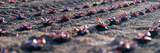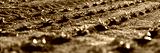 Rows of freshly planted seedlings thriving in rich soil during early morning light at a local community garden