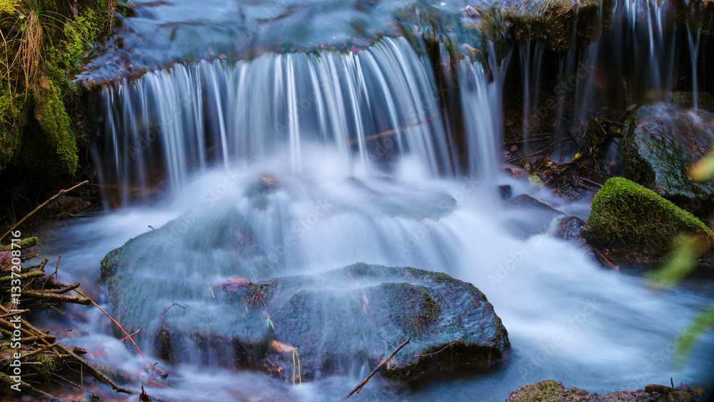 Gentle waterfall cascading over mossy rocks in a serene forest setting during the early morning light