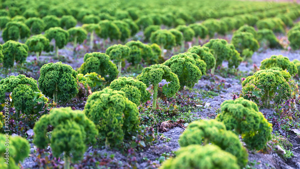 Lush green kale growing in rows on a sunny day in a rural agricultural field
