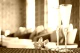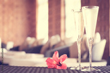 Two glasses of champagne with red flower in a spa lounge. Spa ti