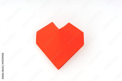 Red paper origami heart on white background .